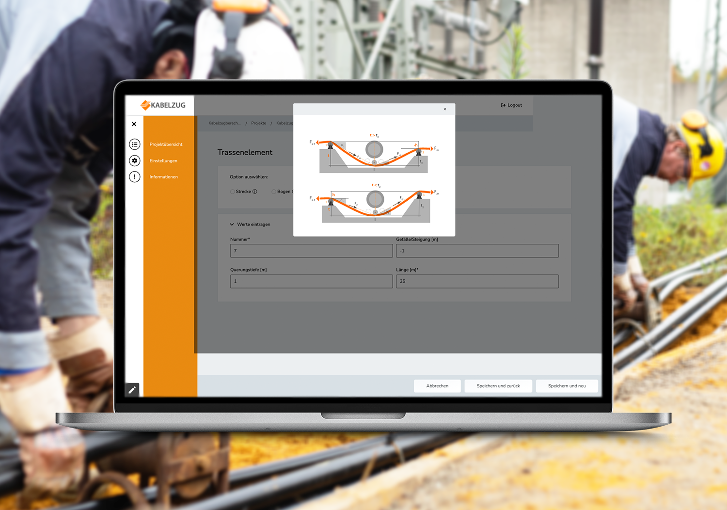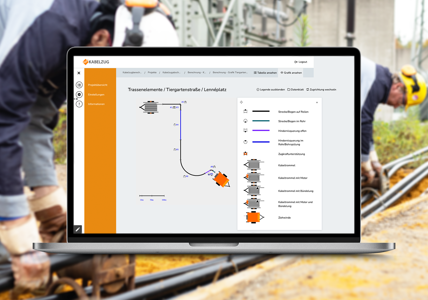 Folgen Sie Ihren Planunterlagen und berechnen für verschiedene Trassenelemente der Kabelzugabschnitte die zu erwartenden Zugkräfte. Nehmen Sie noch während der Bearbeitung Einfluss und optimieren Sie den Kabelzug durch Veränderung möglicher Parameter.